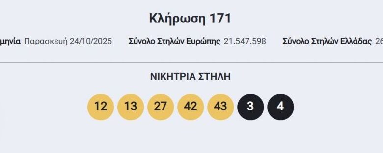 Πραγματοποιήθηκε η σημερινή (24/10) κλήρωση 171 του Eurojackpot, το οποίο μοιράζει το ποσό των 17 εκατομμυρίων ευρώ.