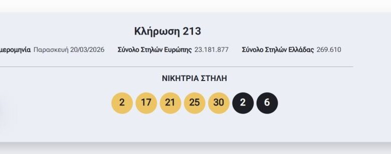 Πραγματοποιήθηκε σήμερα, Παρασκευή (20/3), η κλήρωση 213 του Eurojackpot που μοιράζει 40.000.000 ευρώ στους νικητές της πρώτης κατηγορίας.