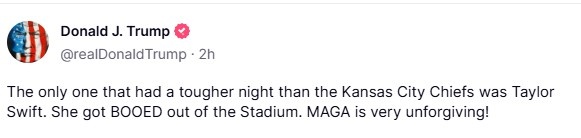 «Η μόνη που είχε πιο δύσκολη νύχτα από τους Κάνσας Σίτι Τσιφς ήταν η Τέιλορ Σουίφτ» έγραψε χαρακτηριστικά στον λογαριασμό του στο Truth Social.