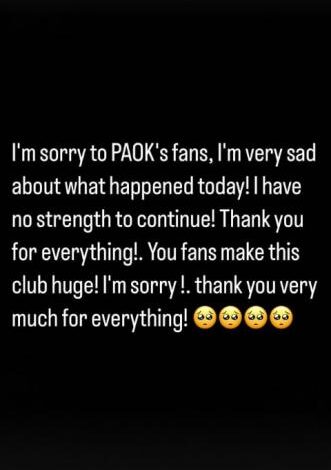 “Ζητώ συγνώμη από τους φίλους του ΠΑΟΚ, είμαι πολύ στεναχωρημένος για ό,τι συνέβη σήμερα! Δεν έχω δύναμη να συνεχίσω! Σας ευχαριστώ για όλα! Εσείς οι φίλοι της ομάδας κάνετε αυτό το κλαμπ τεράστιο! Λυπάμαι! Σας ευχαριστώ πάρα πολύ για όλα!” αναφέρει το story του Τάισον στο Instagram.