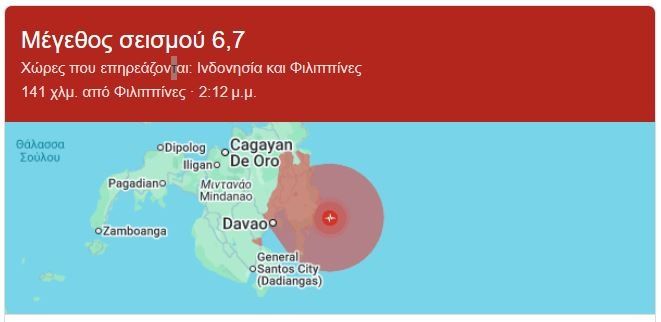 Νέα σεισμική δόνηση μεγέθους 6,7 βαθμών σημειώθηκε σήμερα Παρασκευή 10/10 στις νότιες Φιλιππίνες, σύμφωνα με το σεισμολογικό ινστιτούτο της χώρας, μερικές ώρες μετά τον ισχυρό σεισμό των 7,4 βαθμών που στοίχισε τη ζωή σε τουλάχιστον έξι ανθρώπους.
