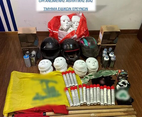 Πιο συγκεκριμένα, κατασχέθηκαν –μεταξύ άλλων- 17- φωτοβολίδες, 7 κοντάρια, σωλήνας εκτόξευσης βολών και 3 κράνη. Τα αντικείμενα εντοπίστηκαν σε κλειδωμένο χώρο του σταδίου του Περιστερίου, που χρησιμοποιείται από τον Ατρόμητο.