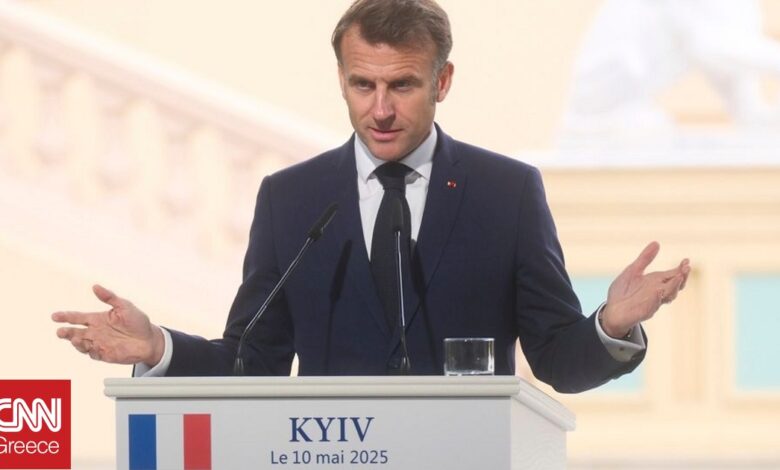 Ο Μακρόν βρέθηκε χθες Σάββατο στο Κίεβο μαζί με τους ηγέτες της Βρετανίας, της Γερμανίας και της Πολωνίας στο πλευρό του Ουκρανού προέδρου Βολοντίμιρ Ζελένσκι προκειμένου να απευθύνουν ένα τελεσίγραφο στη Μόσχα: να δεχθεί «άνευ όρων και πλήρη» εκεχειρία 30 ημερών ή να της επιβληθούν νέες «μαζικές κυρώσεις».